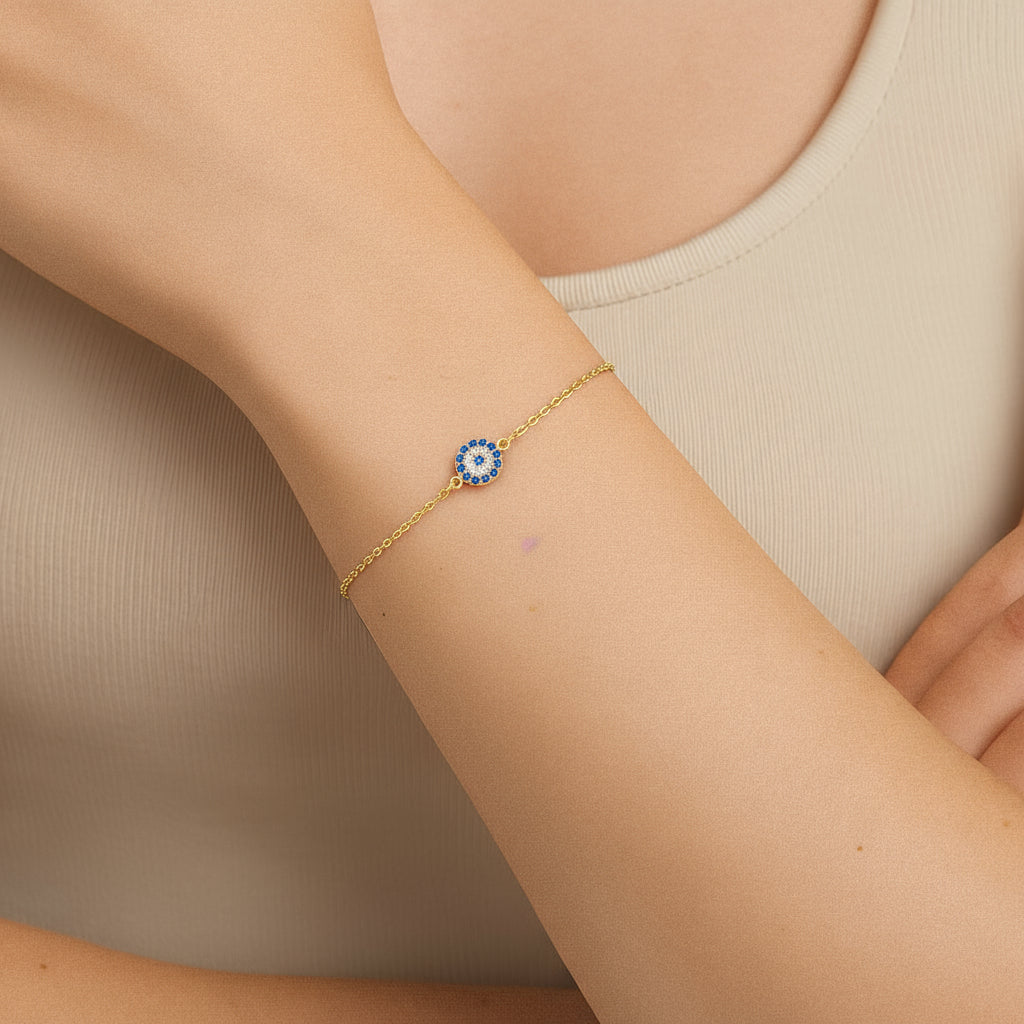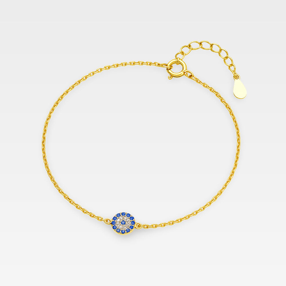 Supercharmig och snygg armband med onda ögat eller även kallad Evil eye. Evil eye armbandet är tillverkad i 925 Sterling silver med 18k guld-plätering. Armbandet har en förlängningskedja som gör att den passar storlekar 17-21,5 cm.