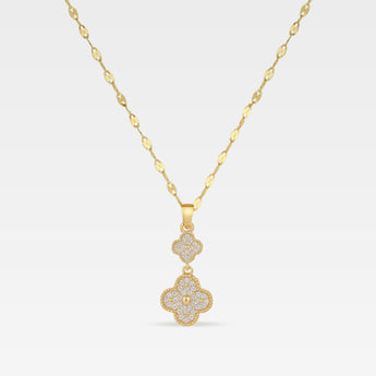 Give your jewelry collection an elegant upgrade with this beautiful four-leaf clover necklace in 18k gold-plated stainless steel. The pendant features two interconnected four-leaf clovers, both covered in sparkling crystals that catch the light from every angle.