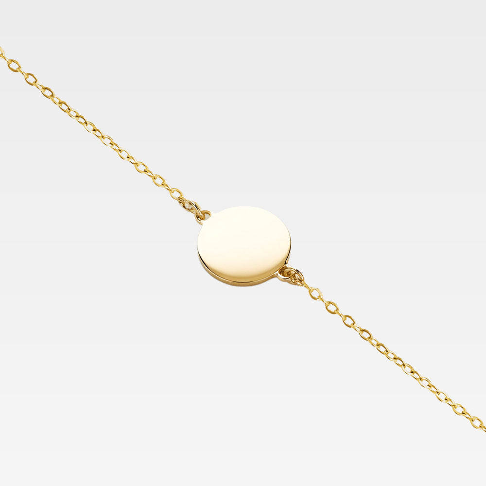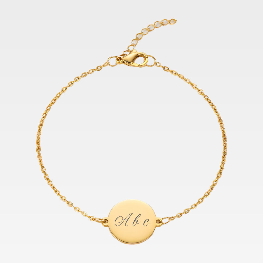 Guldpläterad armband med gravyr på brickan. Armbandet är tillverkad i rostfritt stål med 18k guldplätering. Kedjan är 16 cm + 5 cm förlängning. Passar handleder 16-21 cm.