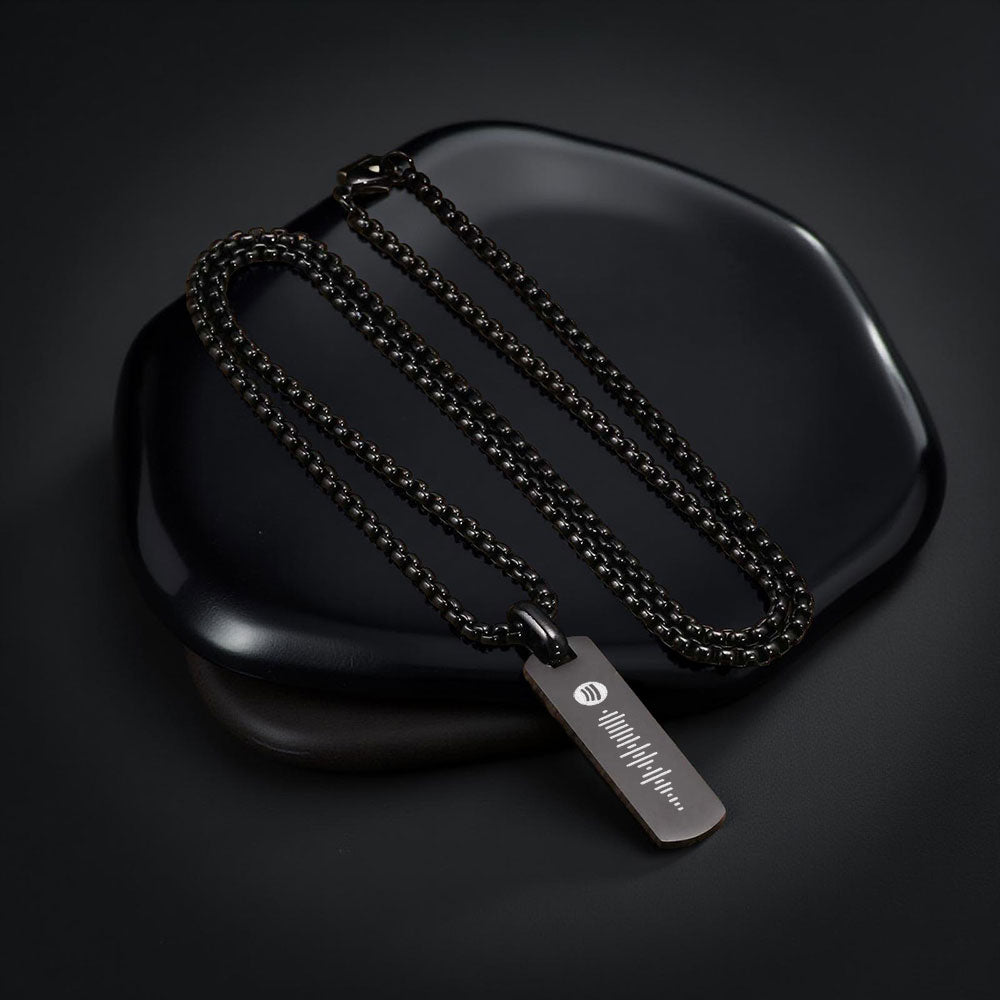 Fin och stilig halsband med svart rektangulär tag. Halsbandet är tillverkad i rostfritt stål med vart beläggning. Kedja på 60 cm. Du kan välja att köpa halsbandet med eller utan gravering.